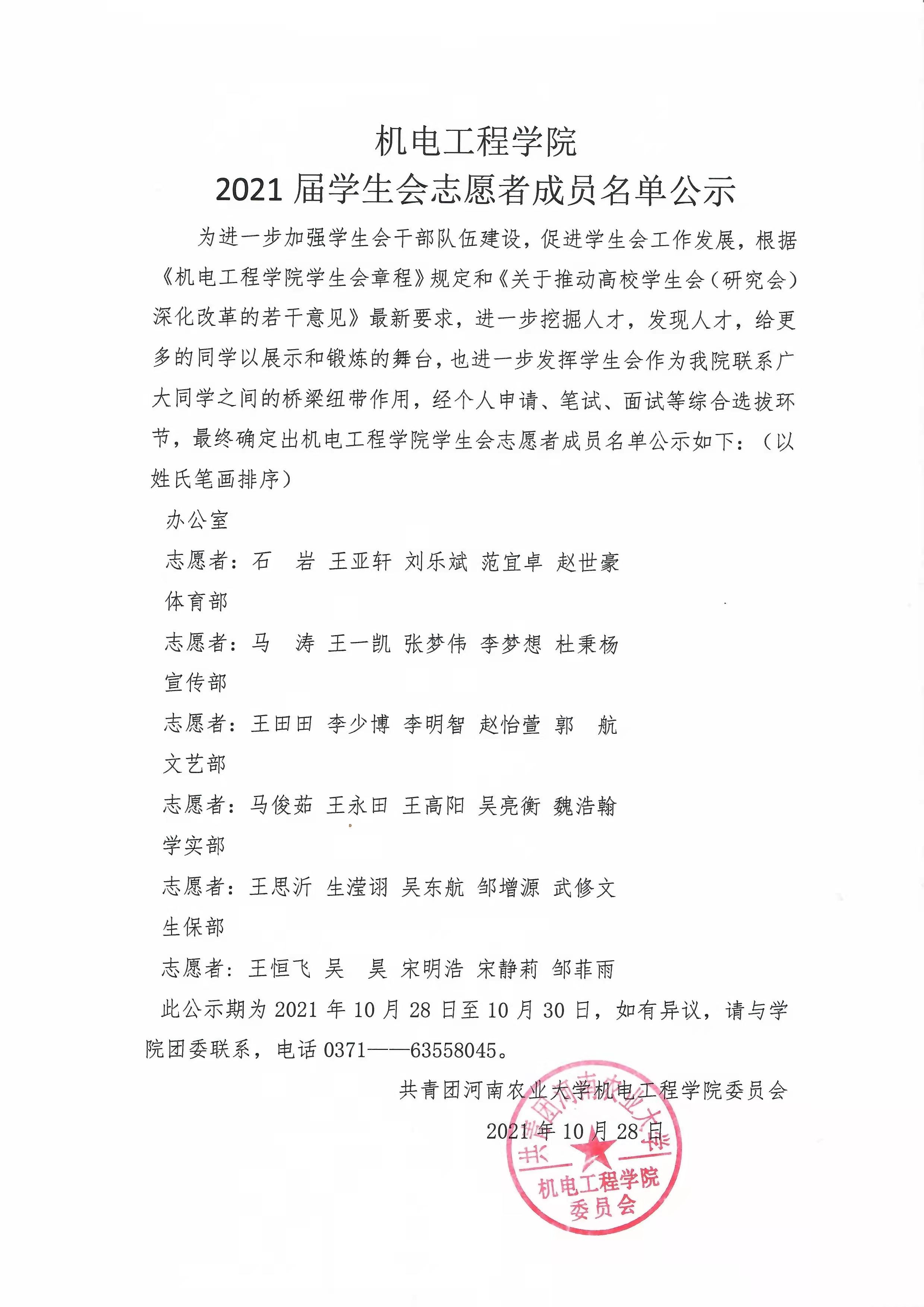 新葡京娱乐城App 2021届学生会志愿者成员名单公示