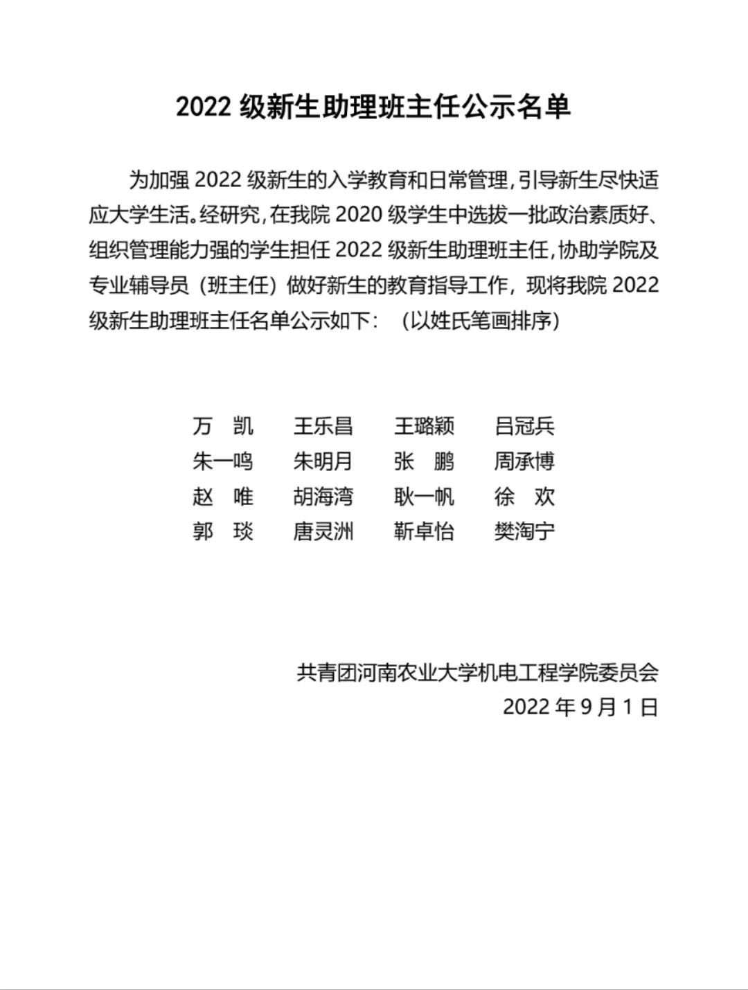 为加强2022级新生的入学教育和日常管理,引导新生尽快适应大学生活。经研究,在新葡京娱乐城App 2020级学生中选拔一批政治素质好、组织管理能力强的学生担任2022级新生助理班主任,协助新葡京娱乐城App 及专业辅导员(班主任)做好新生的教育指导工作,现将新葡京娱乐城App 2022级新生助理班主任名单公示如下:(以姓氏笔画排序)