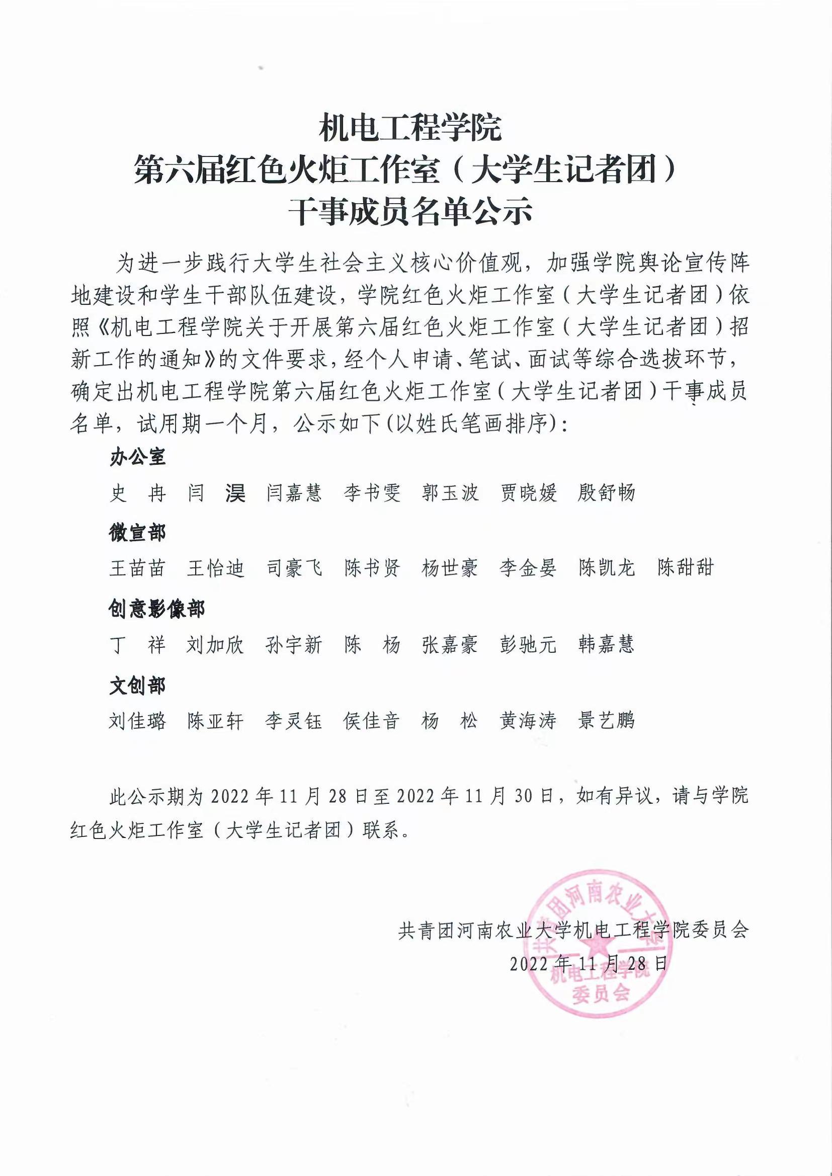 第六届红色火炬工作室(大学生记者团)干事成员名单,试用期一个月,公示如下(以姓氏笔画排序):