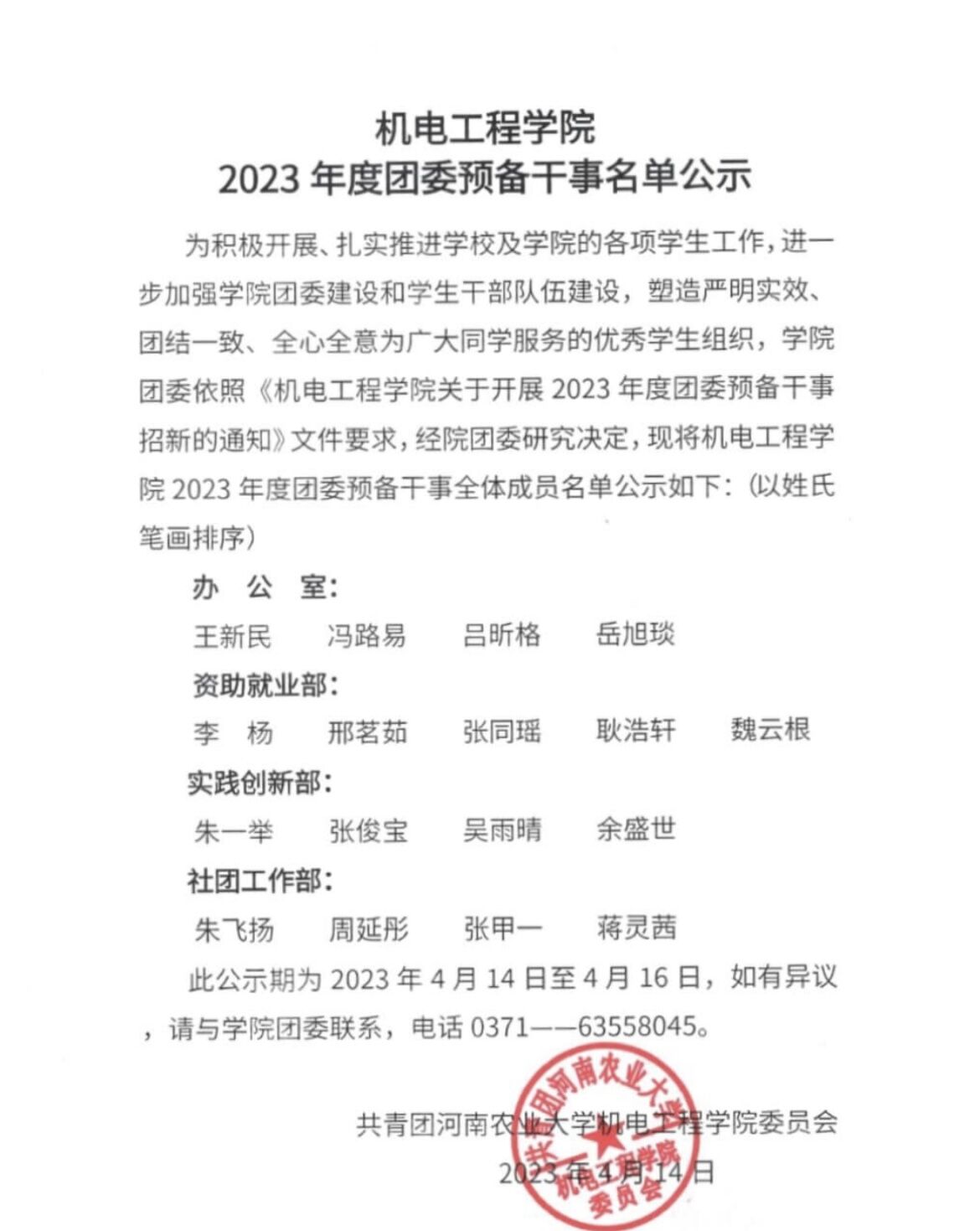 新葡京娱乐城App 2023年度团委预备干事名单公示