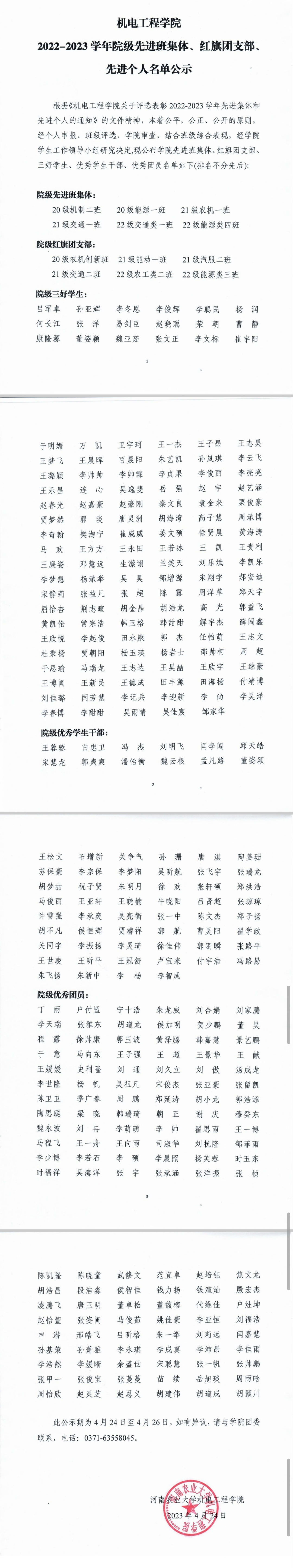 新葡京娱乐城App 2022-2023学年院级先进班集体、红旗团支部、先进个人名单公示