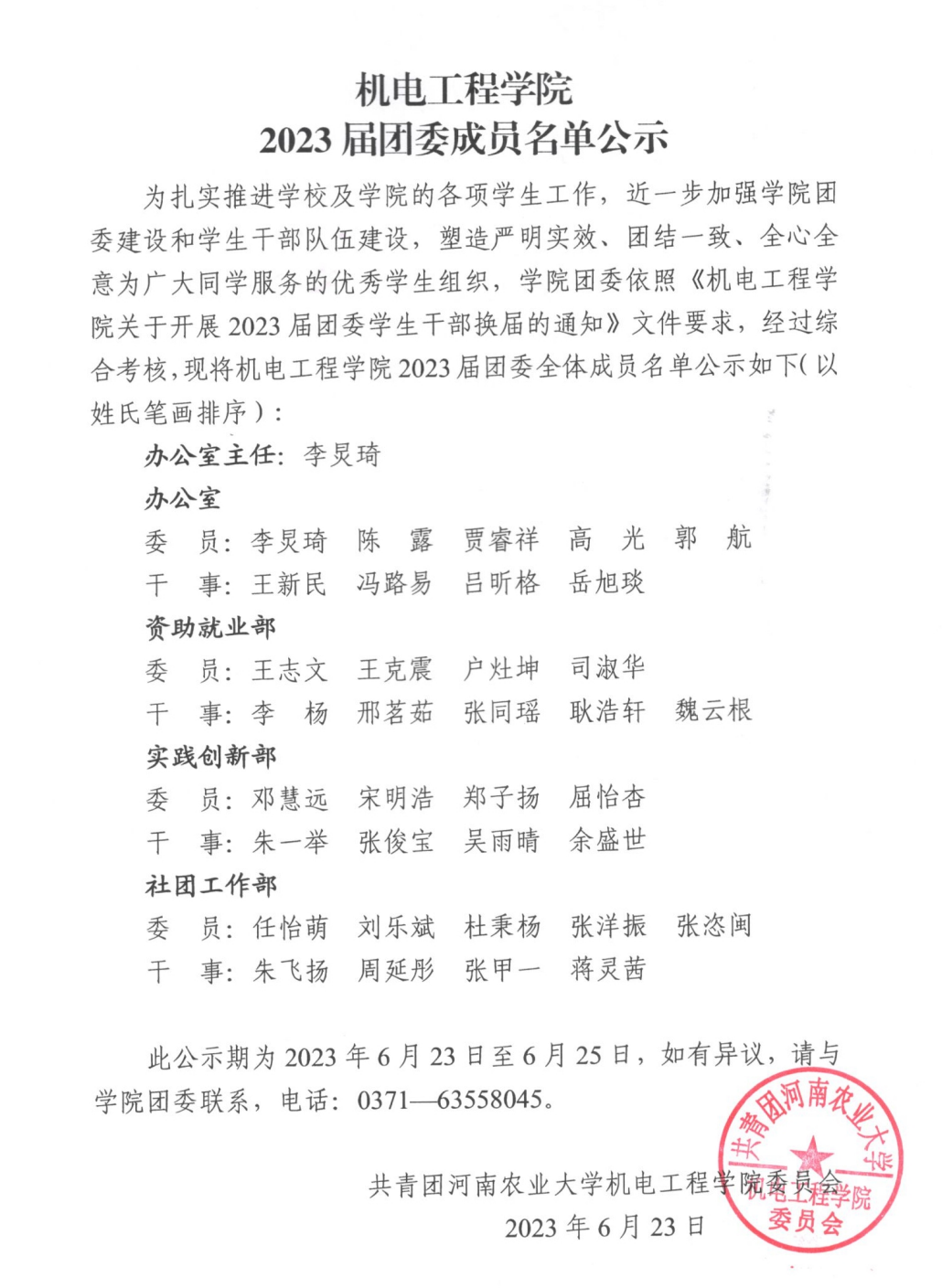 为扎实推进新葡京娱乐城App 及新葡京娱乐城App 的各项学生工作,近一步加强新葡京娱乐城App 团委建设和学生干部队伍建设,塑造严明实效、团结一致、全心全意为广大同学服务的优秀学生组织,新葡京娱乐城App 团委依照《新葡京娱乐城App 关于开展 2023 届团委学生干部换届的通知》文件要求,经过综合考核,现将新葡京娱乐城App 2023 届团委全体成员名单公示如下( 以姓氏笔画排序):