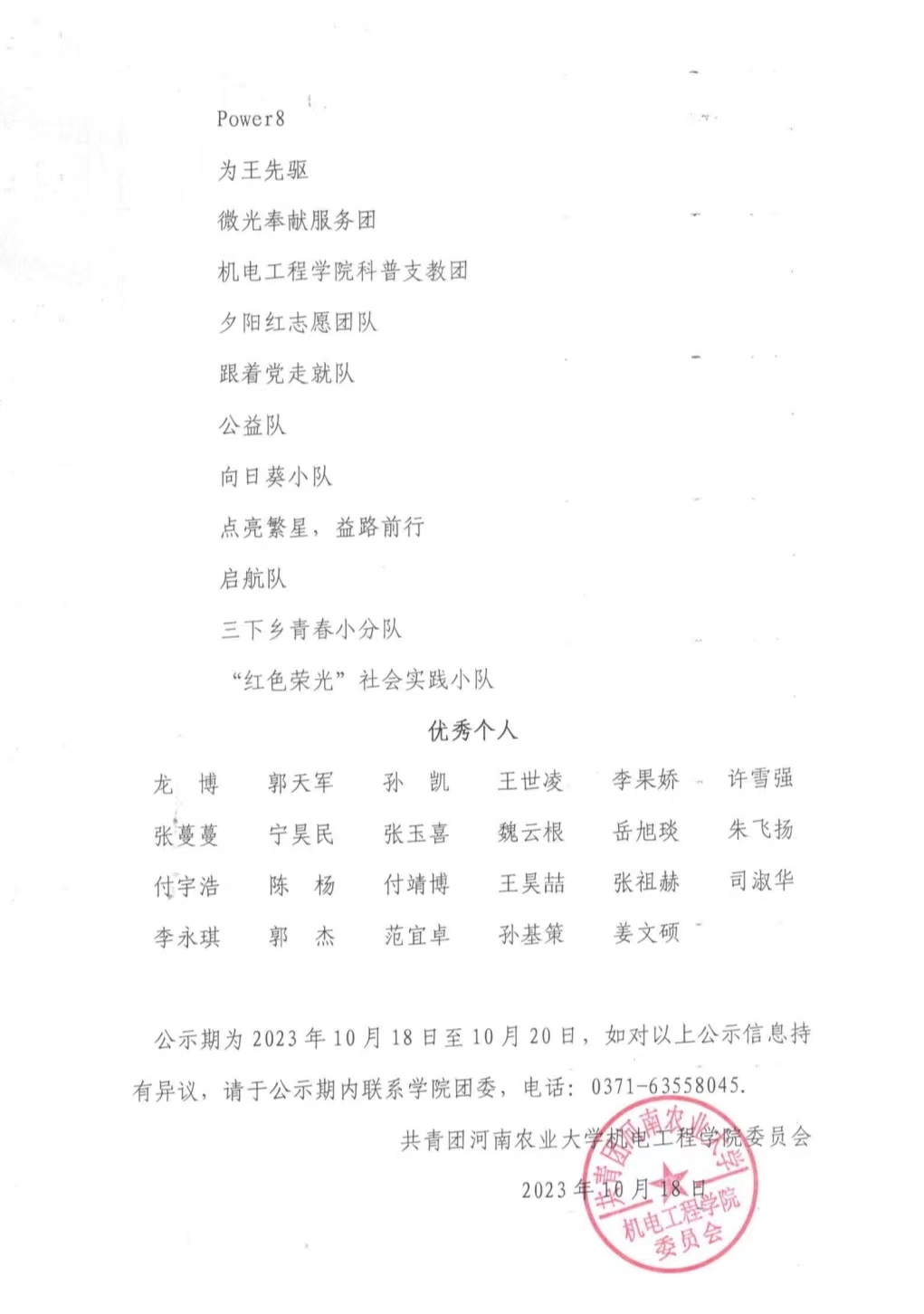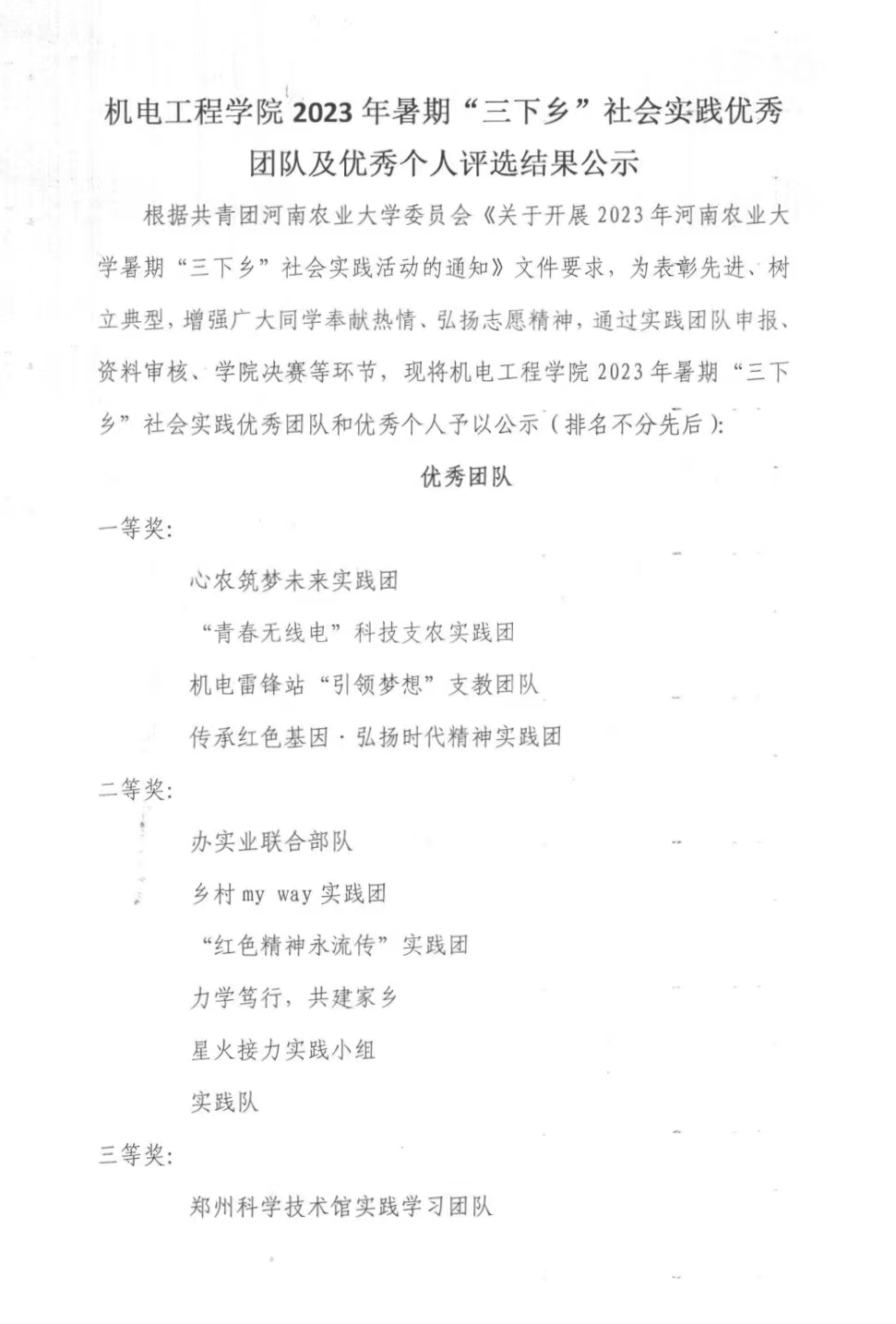 根据共青团新葡京娱乐城App 委员会《关于开展2023年新葡京娱乐城App 暑期“三下乡”社会实践活动的通知》文件要求,为表彰先进、树立典型,增强广大同学奉献热情、弘扬志愿精神,通过实践团队申报、资料审核、新葡京娱乐城App 决赛等环节,现将新葡京娱乐城App 2023年暑期“三下乡”社会实践优秀团队和优秀个人予以公示(排名不分先后):
