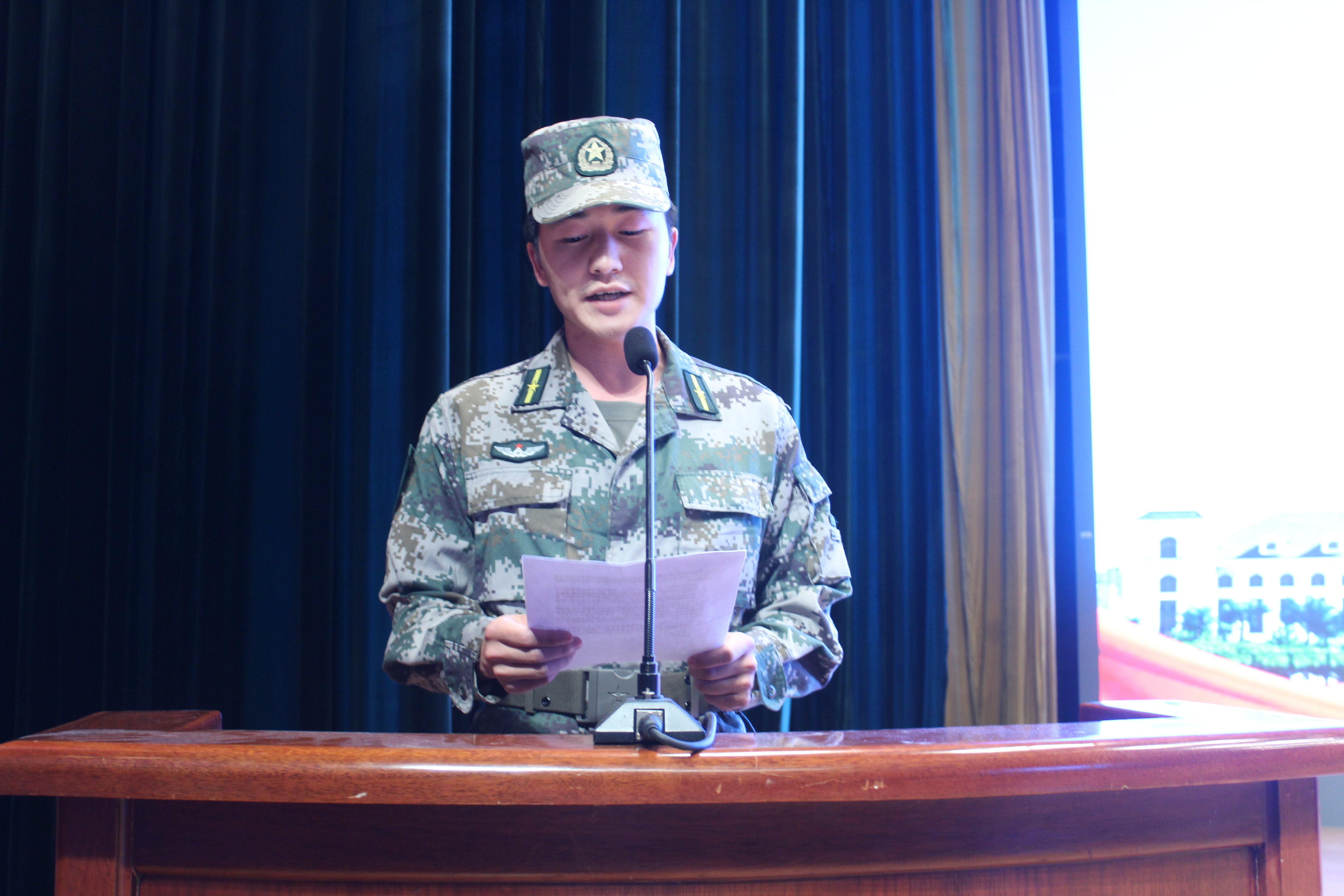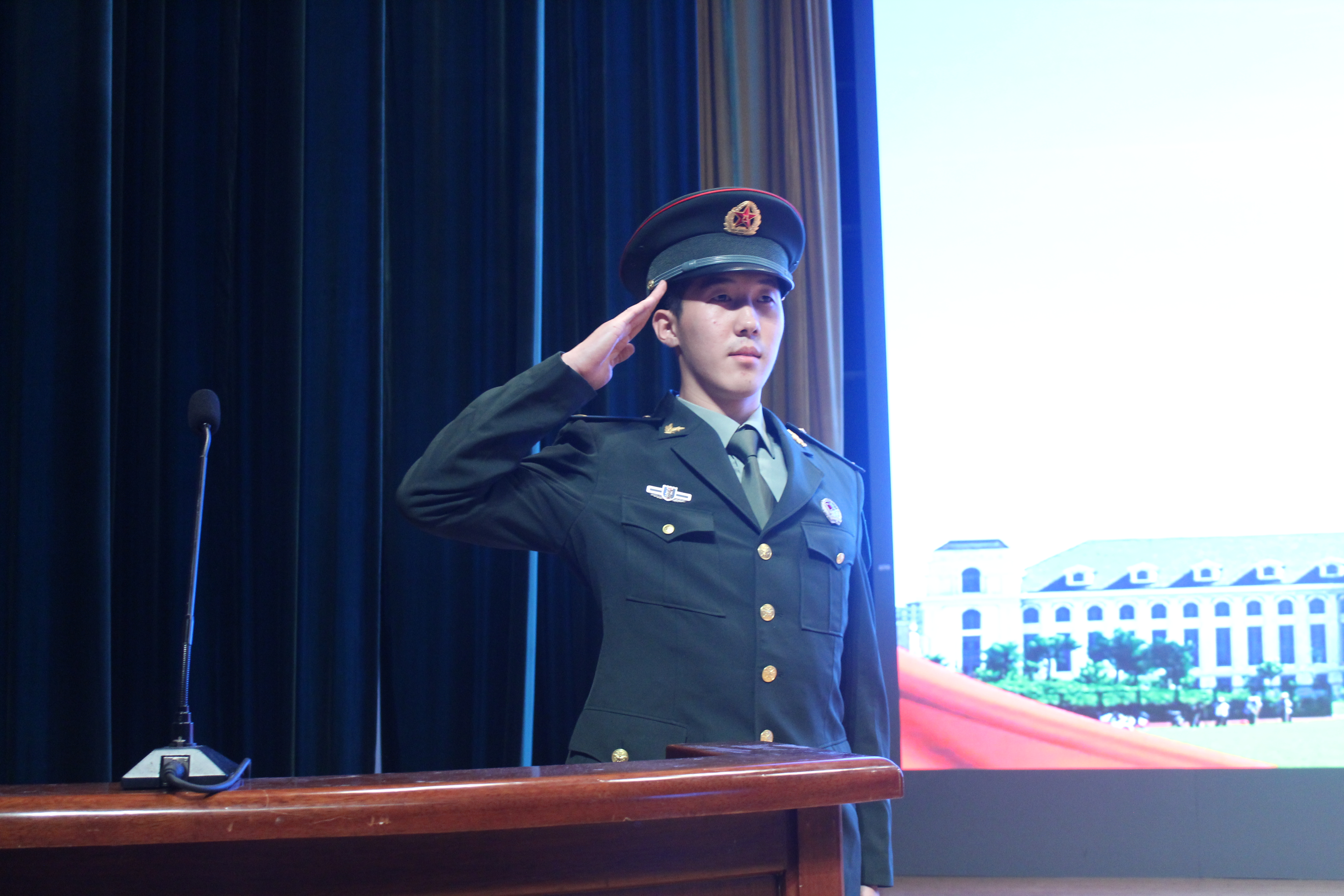农大铁军成员田雪磊作为代表发言,他用自己的实际经历向大家传达了军人的自豪感,同时建议学生们关注国家所处的国际形势,全力以赴、报国无悔,用自己的一腔热血担当起新时代青年大学生的名号。