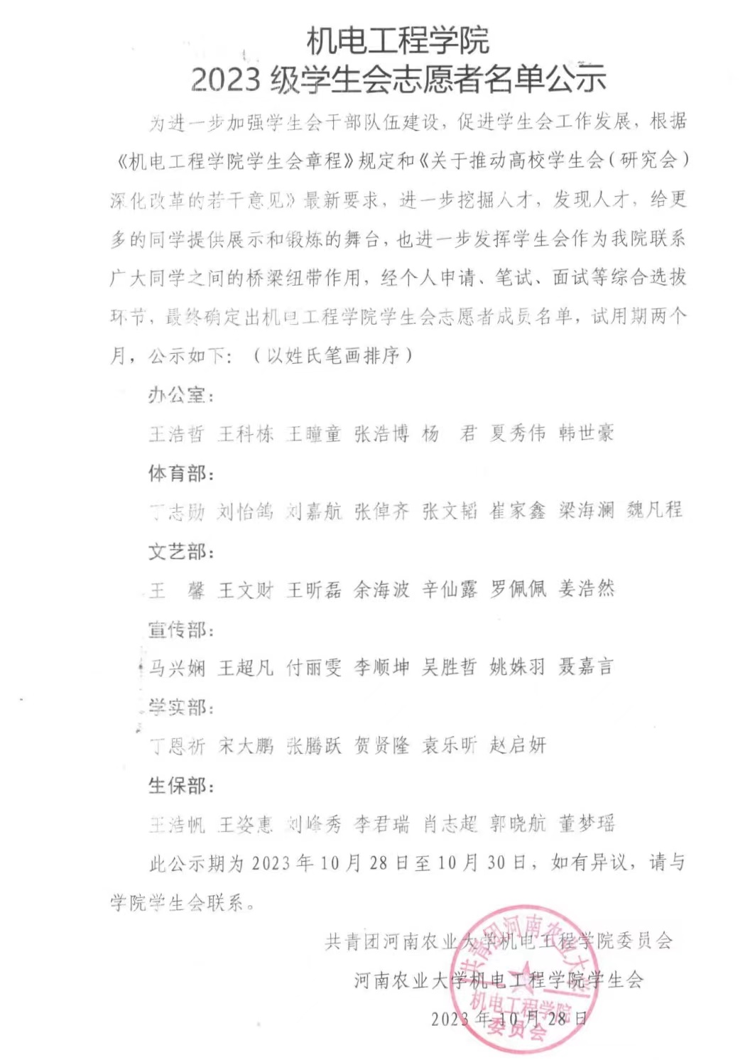 新葡京娱乐城App 2023 级学生会志愿者名单公示
