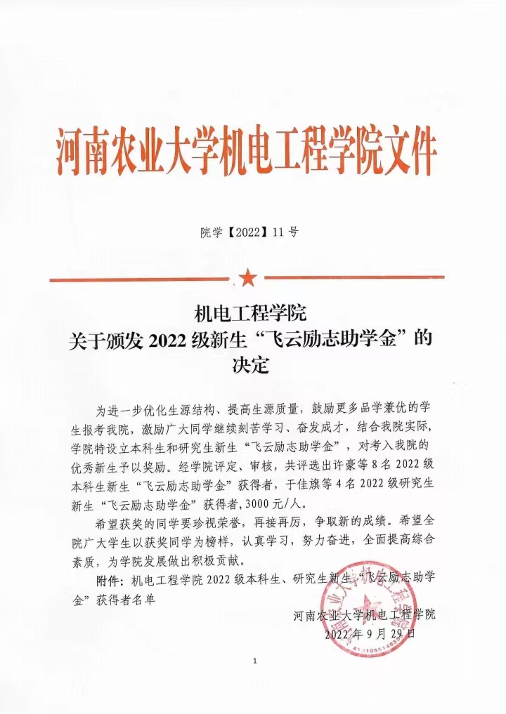 评定、审核,共评选出许豪等8名2022级本科生新生“飞云励志助学金”获得者,于佳旗等4名2022级研究生新生“飞云励志助学金”获得者,3000元/人。