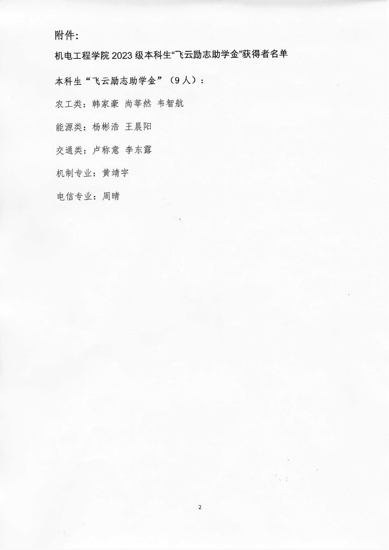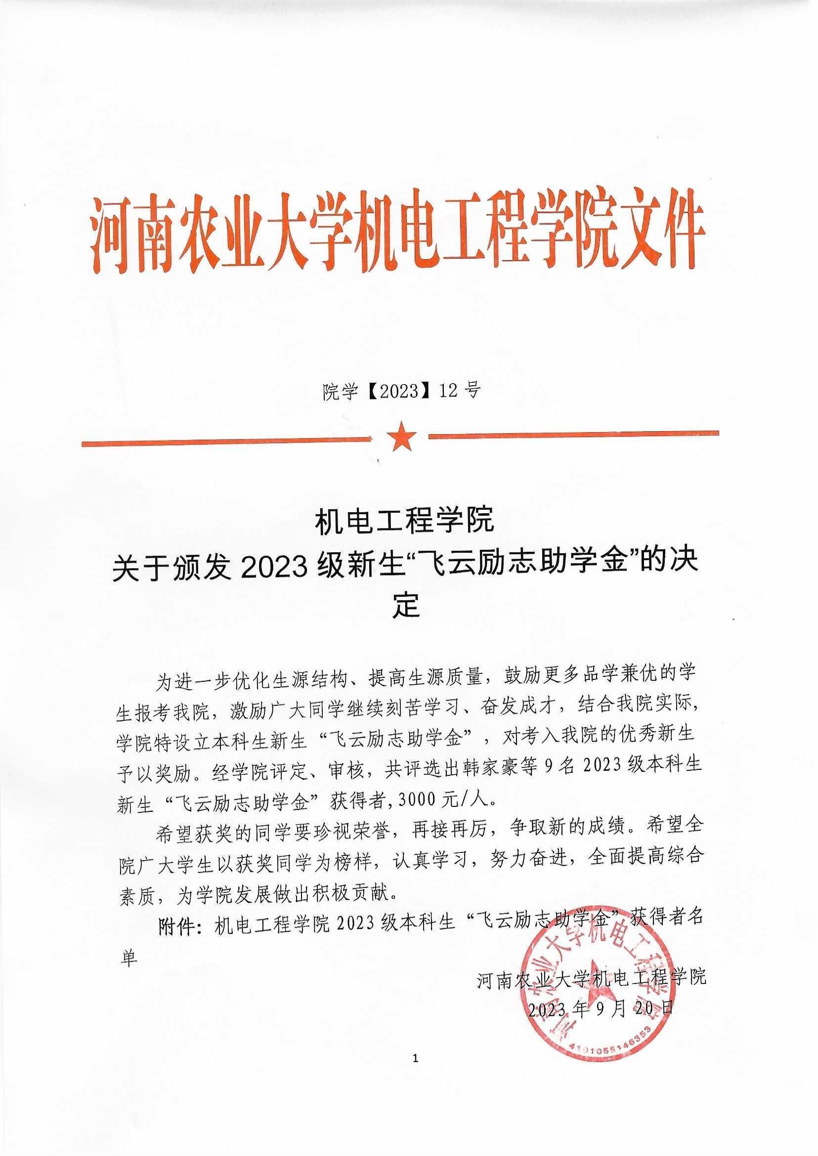 评定、审核,共评选出韩家豪等9名2023级本科生新生“飞云励志助学金”获得者,3000元/人。