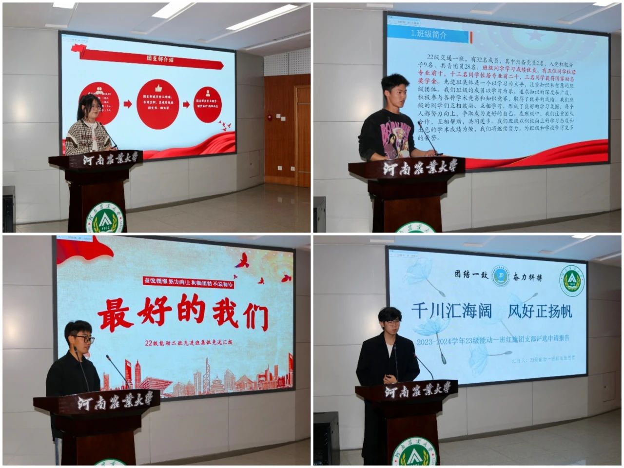 各参评班集体首先进行限时5分钟的PPT展示,他们分别从专业特色、思想教育、班风学风、基础文明等方面进行了具体阐述,优秀班集体离不开思想引领,开展团日活动、党史教育,组织参加青年大学习,培育爱国主义精神,向评委老师和参会同学们充分展现了各自班级风采,重点突出展示各自班级求真务实的良好学风和开拓进取的班级氛围。汇报完毕后,评委老师对参赛同学汇报中出现的问题进行评价和指导,同时表达了助力新葡京娱乐城App