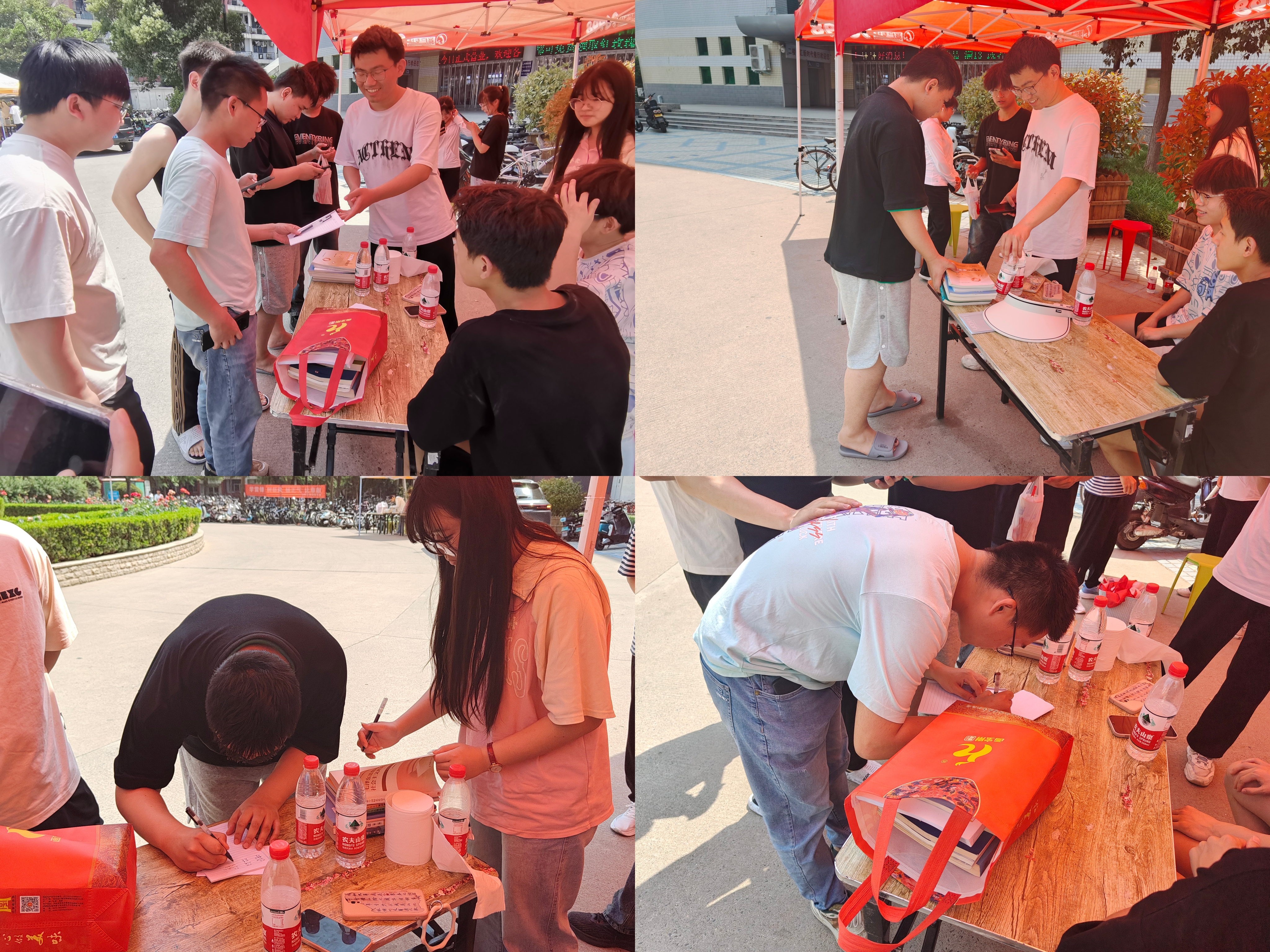 于桃李园学生公寓餐厅门口举办“传递书香温暖心灵,捐赠爱书知识远扬”毕业生捐书活动,年纪辅导员孙改革到现场参加并进行指导。