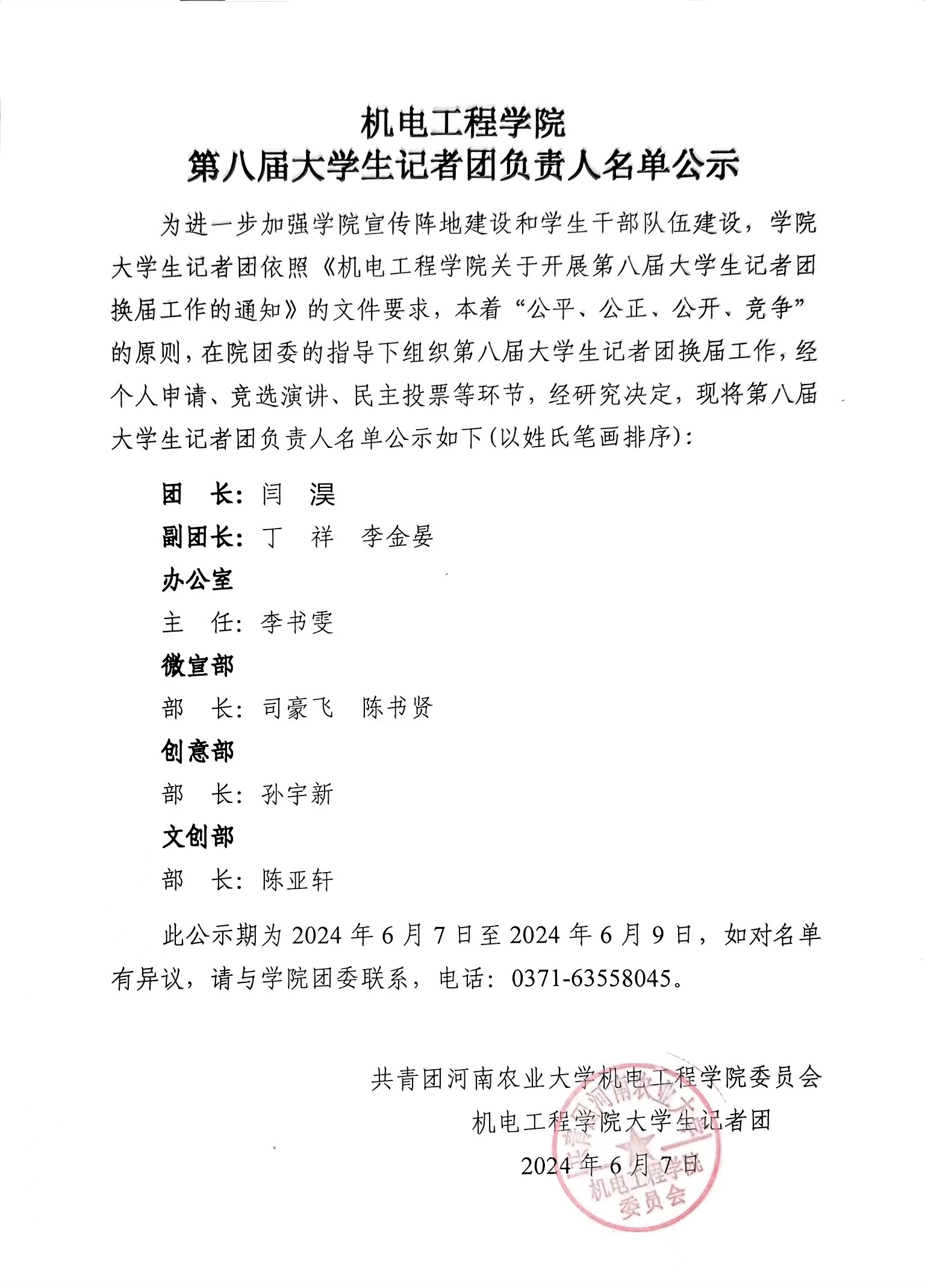 ;  为进一步加强新葡京娱乐城App 宣传阵地建设和学生干部队伍建设,新葡京娱乐城App 大学生记者团依照《新葡京娱乐城App 关于开展第八届大学生记者团换届工作的通知》的文件要求,本着“公平、公正、公开、竞争” 的原则,在院团委的指导下组织第八届大学生记者团换届工作,经个人申请、竞选演讲、民主投票等环节,经研究决定,现将第八届大学生记者团负责人名单公示如下(以姓氏笔画排序):