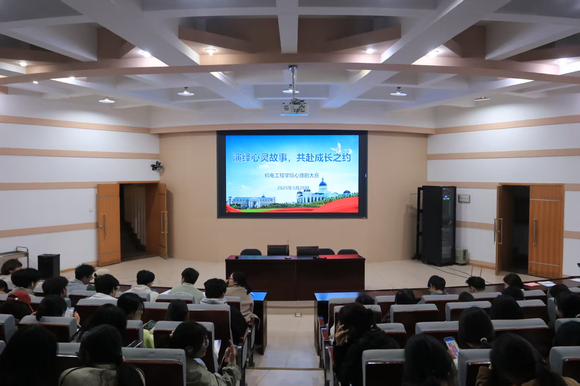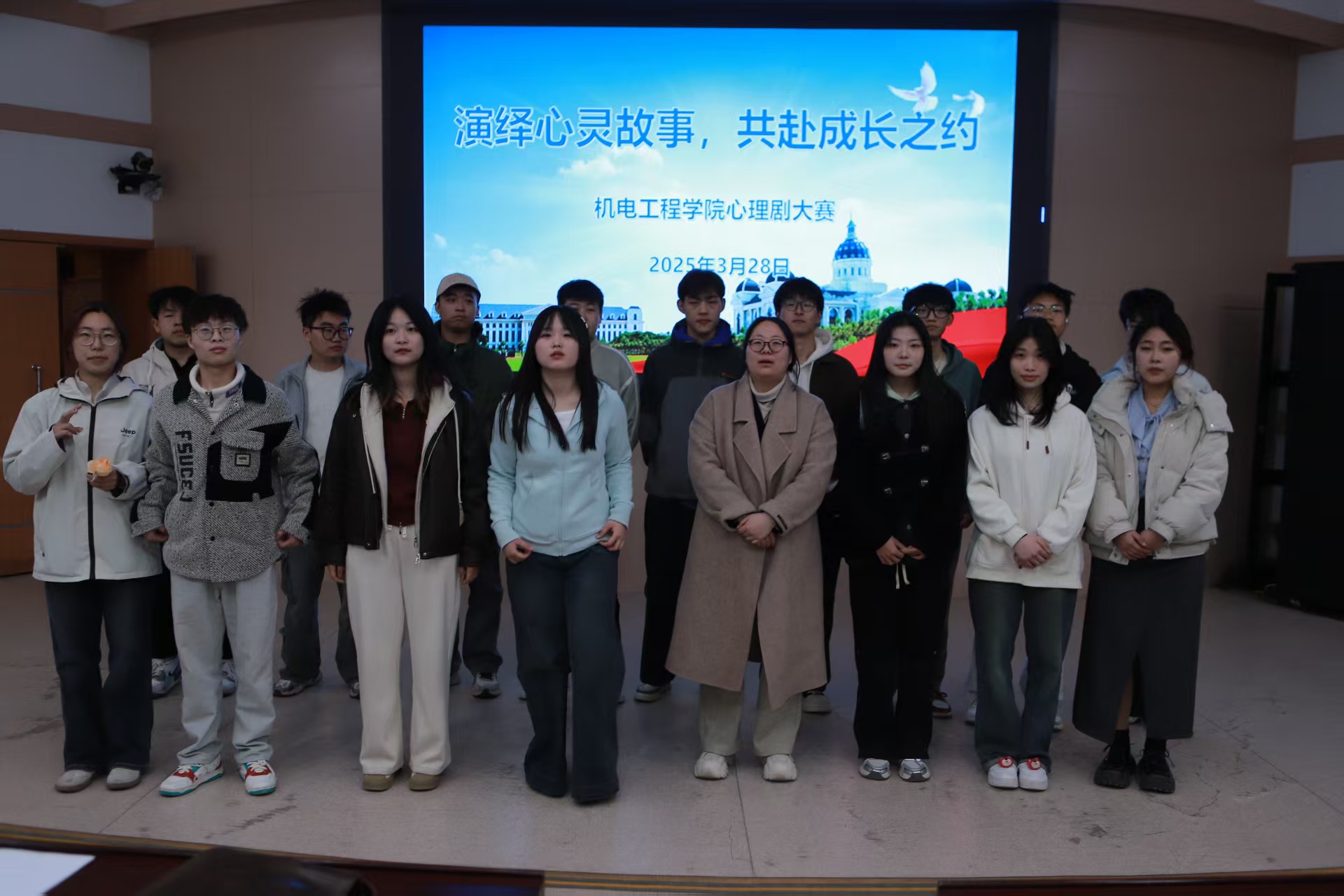 于文化路校区三百人报告厅举办“演绎心灵故事,共赴成长之约”心理剧大赛,年级辅导员孙改革和学生代表参与本次大赛并担任评委。