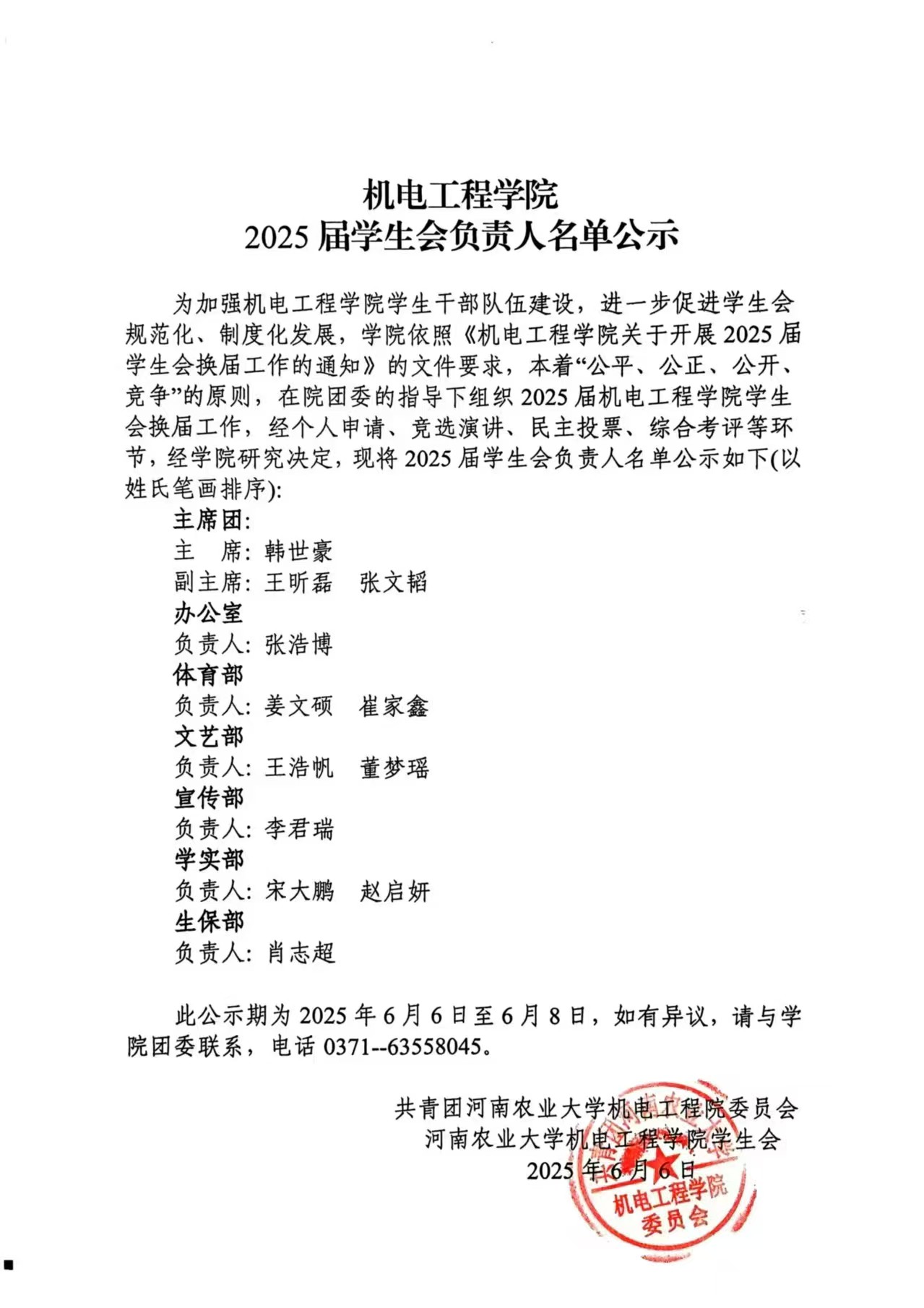 为加强新葡京娱乐城App 学生干部队伍建设,进一步促进学生会规范化、制度化发展,新葡京娱乐城App 依照《新葡京娱乐城App 关于开展2025届学生会换届工作的通知》的文件要求,本着“公平、公正、公开、竞争”的原则,在院团委的指导下组织2025届新葡京娱乐城App 学生会换届工作,经个人申请、竞选演讲、民主投票、综合考评等环节,经新葡京娱乐城App 研究决定,现将2025届学生会负责人名单公示如下(以姓氏笔画排序):