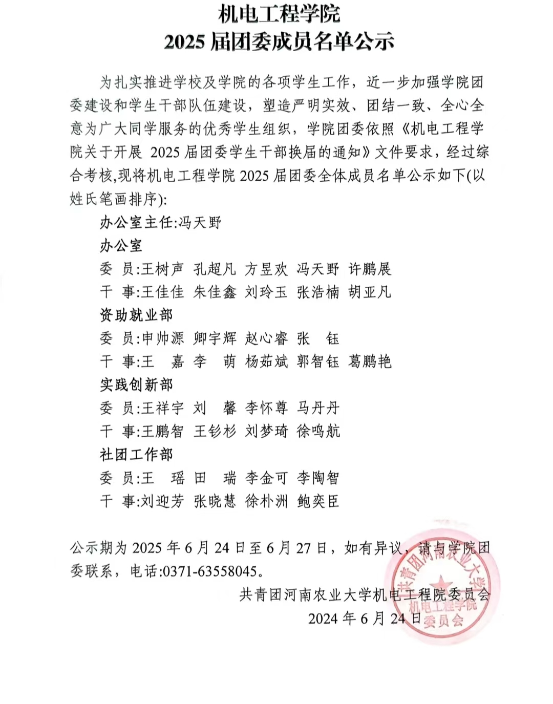 为扎实推进新葡京娱乐城App 及新葡京娱乐城App 的各项学生工作,近一步加强新葡京娱乐城App 团委建设和学生干部队伍建设,塑造严明实效、团结一致、全心全意为广大同学服务的优秀学生组织,新葡京娱乐城App 团委依照《新葡京娱乐城App 关于开展2025届团委学生干部换届的通知》文件要求,经过综合考核,现将新葡京娱乐城App 2025届团委全体成员名单公示如下(以姓氏笔画排序):