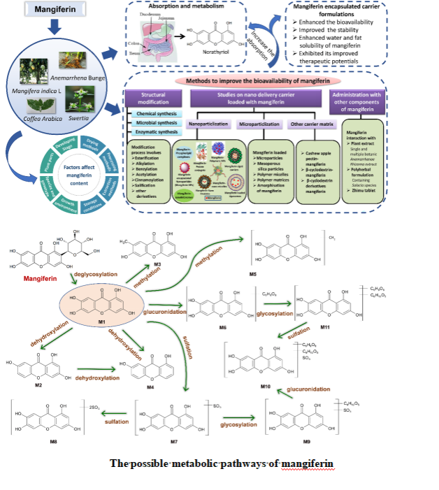 Mangiferin has a variety of biological activities and has broad application prospects in the fields of nutraceuticals and functional foods. However, the low bioavailability of mangiferin limits its application. This paper systematically introduces the dietary sources of mangiferin, the main factors affecting the content of mangiferin, the absorption and metabolism characteristics of mangiferin, and the latest progress of research work to improve the bioavailability of mangiferin. In addition, this article also reviews the patented methods used to improve the bioavailability of mangiferin.