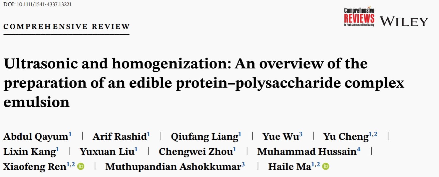 任晓锋教授课题组在国际食品安全和营养领域顶级期刊《Comprehensive Reviews in Food Science and Food Safety》(Q1,IF=14.8)在线发表了的最新研究成果——“Ultrasonic and homogenization: An overview of the preparation of an edible protein–polysaccharide complex emulsion”(DOI: 10.1111/1541-4337.13221)。新葡京娱乐城app