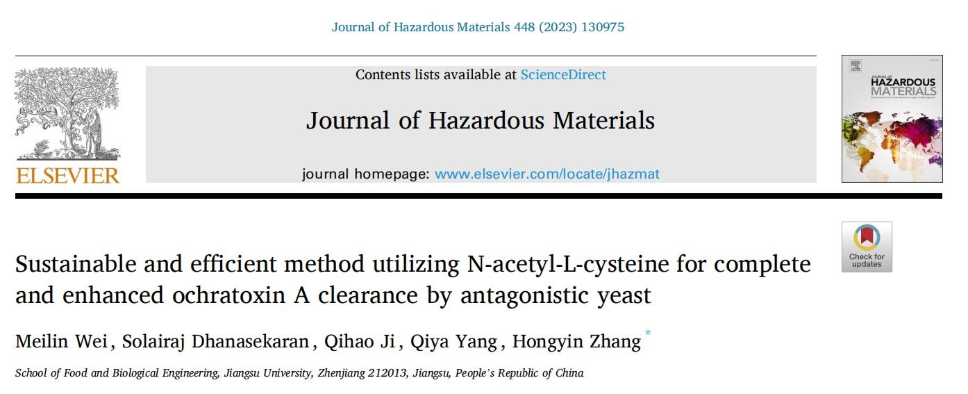张红印教授团队在国际顶级期刊Journal of Hazardous Materials(中科院一区)发表题为“Sustainable and efficient method utilizing N-acetyl-L-cysteine for complete and enhanced ochratoxin A clearance by antagonistic yeast”的研究论文(2023,448,15),研究了抗氧化剂N-乙酰-L-半胱氨酸对隐球酵母Y3降解赭曲霉毒素A的促进作用以及对酵母自身代谢的影响。新葡京娱乐城app