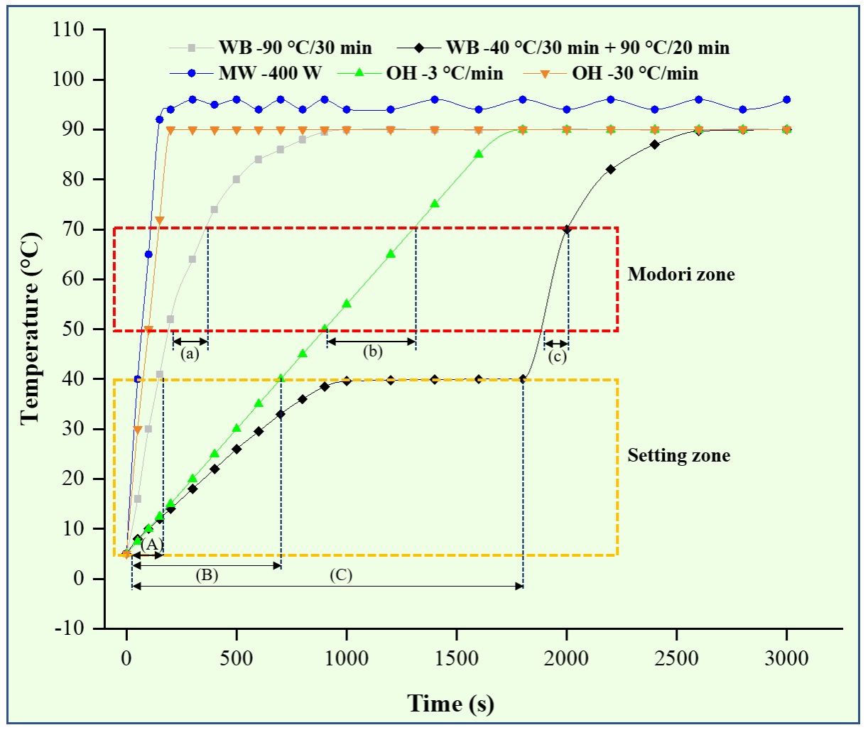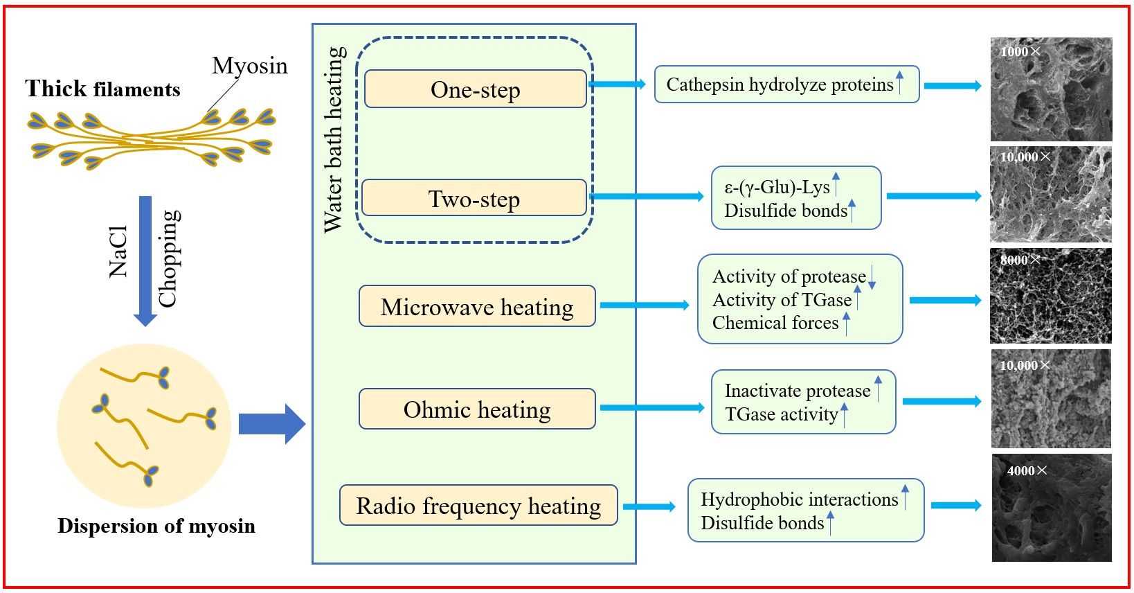 通过改变蛋白质结构或鱼糜制品中内源酶活性来改善鱼糜制品的凝胶特性的各种加热方法的有效性已经得到证实,包括微波加热、射频加热和欧姆加热。在加热过程中,蛋白质之间的化学作用力随蛋白质结构的变化而变化,这可能对鱼糜制品凝胶的网络产生积极或消极的影响。在这种情况下,根据鱼糜蛋白对不同加热模式下热响应的不同,通过调控加热温度、时间或加热速率来改变蛋白结构,使蛋白分子间更多有利于蛋白分子交联的化学作用力的形成。此外,在加热过程中可控制鱼糜中的内源酶活性,以减少蛋白质的降解或增强蛋白与蛋白之间的交联,达到改善凝胶品质的目的。然而,准确评估这些加热方法对鱼糜蛋白结构和凝胶性能的影响是复杂的,因为其他的许多因素,包括鱼种、pH值、离子强度等也会影响凝胶品质。与传统的水浴加热相比,新兴加热技术具有改善鱼糜制品凝胶品质的潜力。然而,目前这些技术仍具有一定的局限性,实现大规模工业化生产品质优良的热诱导鱼糜凝胶制品需要进一步研究。