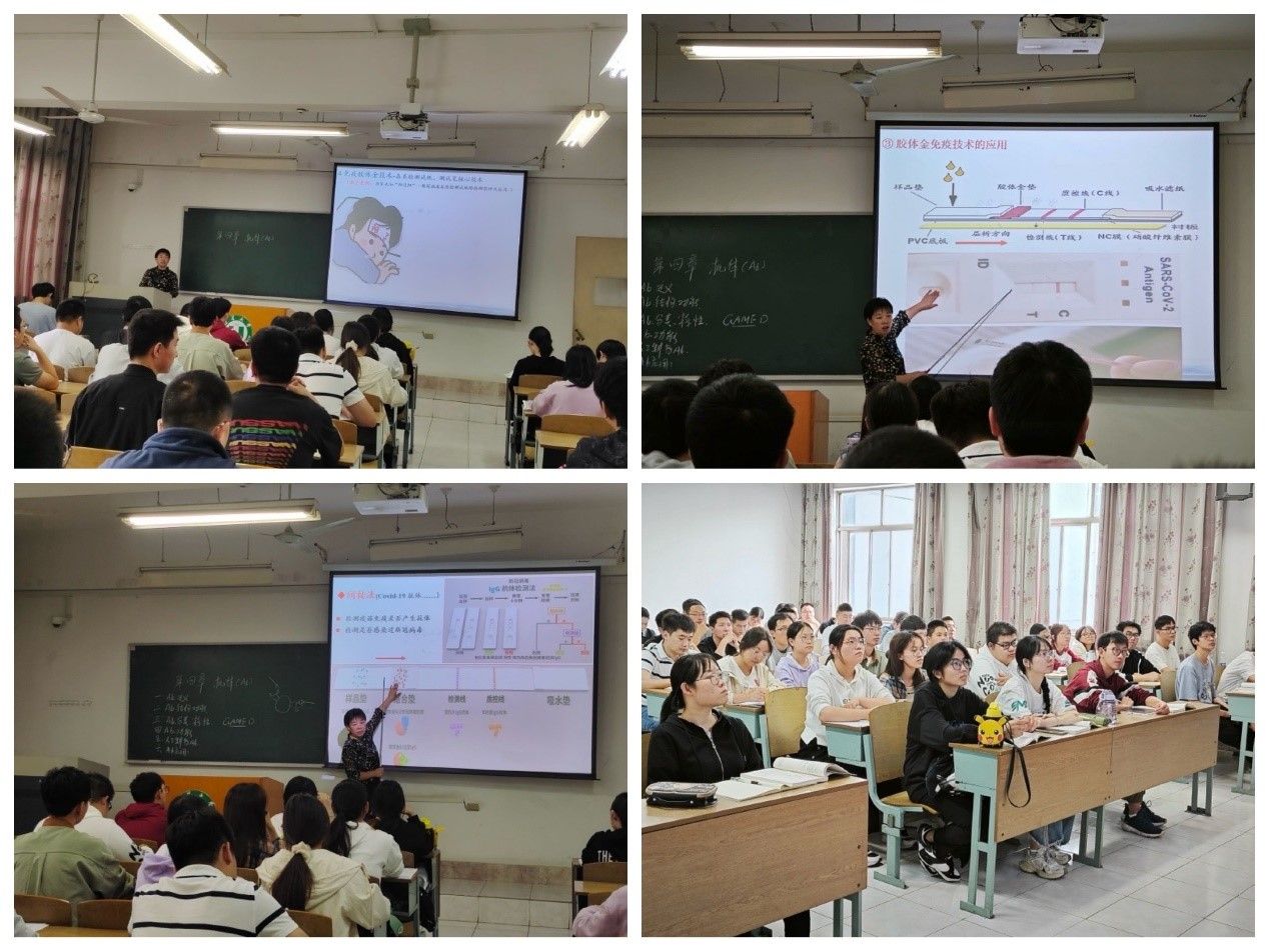 课上,蔡梅红老师在简单回顾上节课堂讲授的抗体的免疫学应用(免疫荧光技术、酶联免疫吸附技术、免疫放射技术)内容基础上,引出本节公开课的新内容—免疫胶体金技术。蔡老师结合我们刚刚经历过的新冠病毒疫情,运用了2022年新葡京娱乐城app