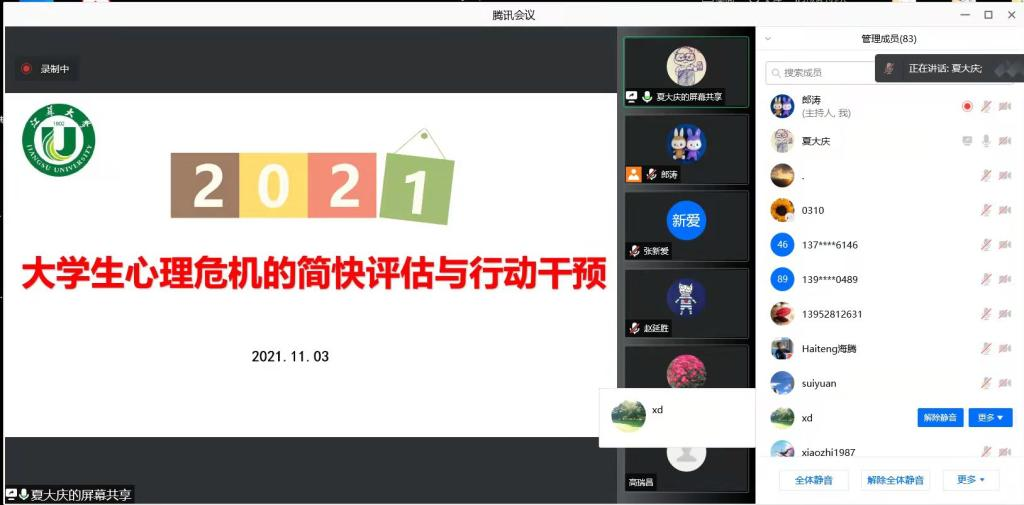 副书记夏大庆为导师做了“大学生心理危机的简快评估与行动干预”的报告,从心里危机分类诱因、识别、考量因素、危机评估、干预等方面,详细介绍了研究生培养过程中遇到的心理相关问题和解决的方法,并呼吁导师更多的关心有心理问题的学生,帮助他们顺利地完成学业,成长、成才。
