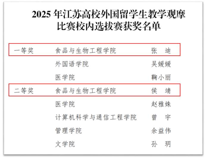 经过专家评审,张迪老师荣获本科理工组一等奖,侯婧老师获得二等奖,两位教师均被推荐参加2024年江苏高校外国留学生教学观摩比赛省级赛事,展现了新葡京娱乐城app