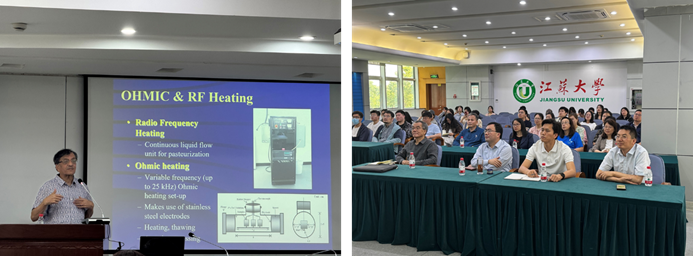 报告伊始,Swamy教授深入浅出地介绍了微波加热技术的基本原理,并结合其在食品加工中的最新研究成果与应用实例,展示了该技术在提升加热效率、保障食品安全与品质方面的重要价值。随后,他又拓展介绍了欧姆加热(Ohmic heating)、射频加热(Radio Frequency heating)等其他物理加工技术,重点讲解了各类技术在食品行业中的应用特点、研究进展以及工程挑战。Swamy教授用生动详实的案例与形象的图示,使在场师生能够更直观地理解不同物理加热技术之间的差异与适用场景。在报告结束后的互动环节中,Swamy教授热情地与在场师生进行了深入交流,认真解答了大家提出的科研疑问,现场气氛热烈,讨论深入,展现出浓厚的学术氛围。