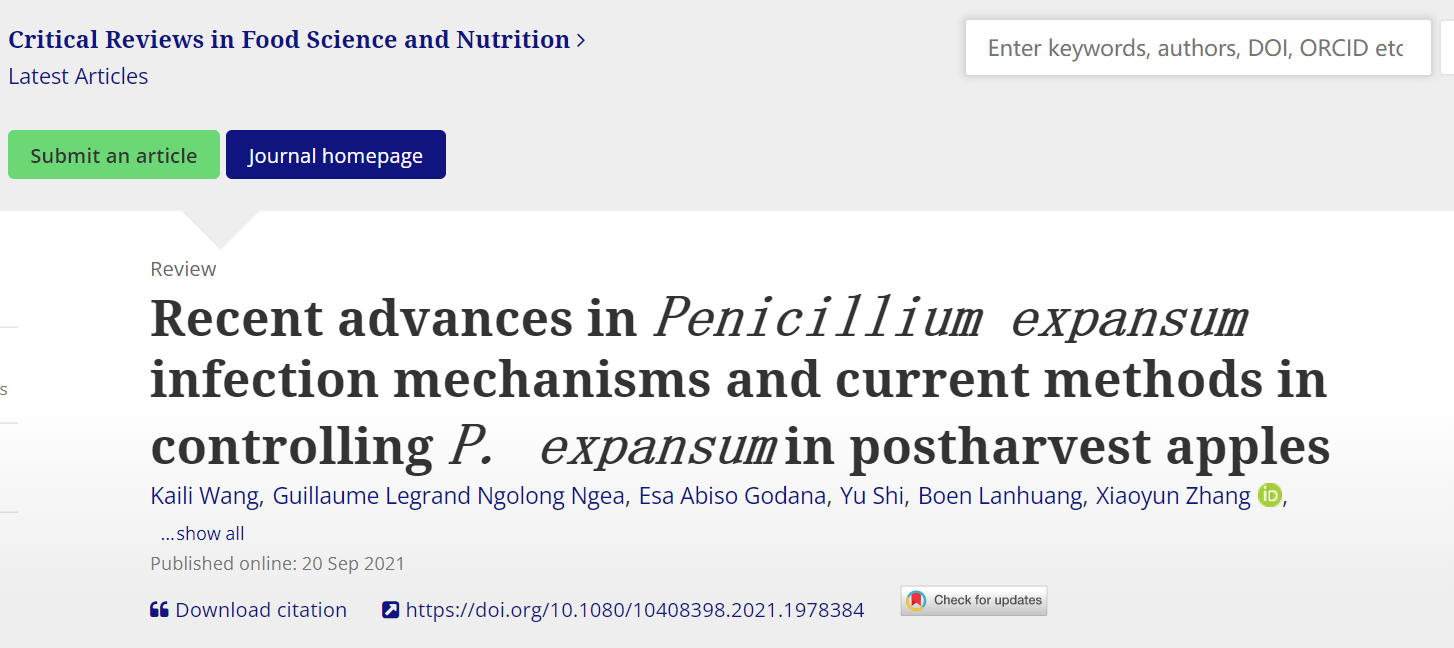 张红印教授在国际食品领域顶级期刊CriticalReviews in Food Science and Nutrition(IF 11.176)在线发表题为“Recent advances inPenicillium expansuminfection mechanisms and current methods in controllingP. expansumin postharvest apples”的综述(//doi.org/10.1080/10408398.2021.1978384),系统阐述了扩展青霉侵染苹果的分子机制及其防治策略方面的最新研究进展。该成果已被《食品科学》公众号(//mp.weixin.qq.com/s/QBqj537ULx_Fqoum3V7PvA)推送,并被食品科学网(//www.chnfood.cn/7293.html)、新浪微博等媒体广泛报道,产生了较大的学术影响。本文的第一作者为新葡京娱乐城app