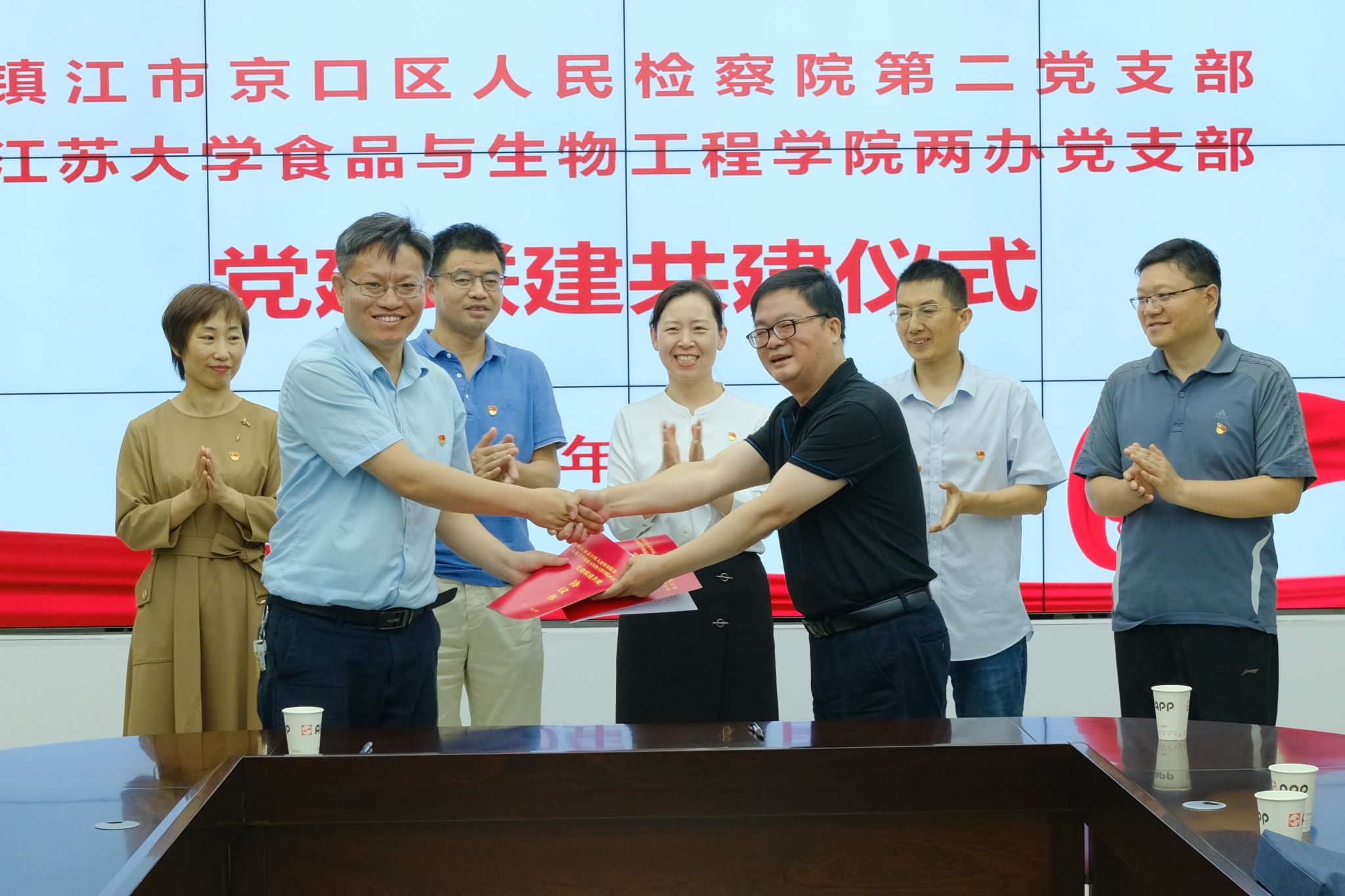 为进一步探索党建工作模式,拓展校地合作新领域,巩固拓展党史学习教育成果,6月8日,食生学院两办党支部与京口区检察院第二党支部签署校检合作共建协议。京口区检察院党组成员、政治部主任、党总支书记杨钰,党总支副书记、第二党支部书记张波,江苏大学食品与生物工程学院党委书记万由令,两办党支部全体党员及师生党员代表参加签约仪式。