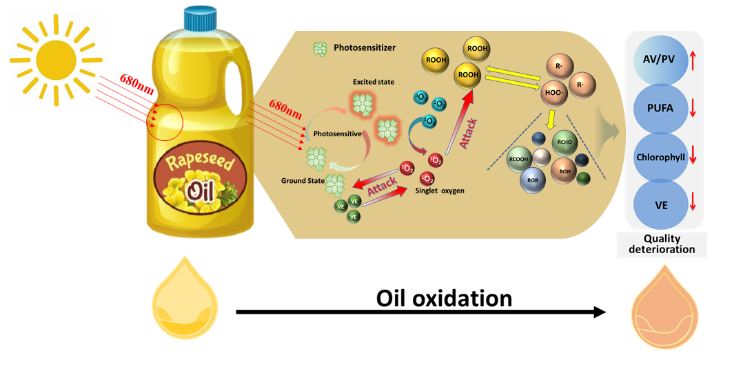 浓香风味菜籽油是以菜籽为原料,经焙炒、压榨、过滤、水化脱胶制取,其香味浓郁,口感滑爽,营养价值高,具有特有的气滋味,深受消费者青睐。鉴于其精炼度较低,成分丰富但复杂,显著影响了其品质稳定性和销售货架期。基于工业生产和应用现状,该研究系统对比了储藏条件(单波长光照、储藏温度、顶空体积等)对清香型和浓香型菜籽油在为期6个月储藏过程中的品质和氧化过程的变化,经挖掘了导致其整体品质劣化的主要机制。结果表明,精炼程度高的清香菜籽油比浓香菜籽油具有更稳定的理化性质和营养品质。光照、高温和顶空体积共同加速了油的氧化,对菜籽油的整体质量产生了不利影响。其中,首次明确了红光(680 nm)对浓香菜籽油的品质劣变贡献度最大,可能由于低精炼度的浓香菜籽油残存的叶绿素在红光(680 nm)下由基态变为激发态,产生1O,攻击亚麻酸等不饱和脂肪酸,产生大量的二次氧化产物,最终导致浓香菜籽油的品质快速劣变。研究结果为选择控制浓香菜籽油变质过程和延长浓香菜籽油保质期的策略提供参考。