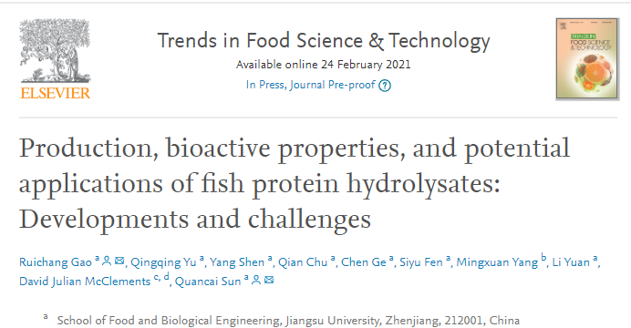 高瑞昌教授团队标题为“Production, bioactive properties, and potential applications of fish protein hydrolysates: Developments and challenges”(鱼蛋白水解物的生产、生物活性和潜在应用:发展与挑战)的综述文章在国际食品领域TOP期刊(No.1)《Trends in Food Science & Technology》在线发表()。新葡京娱乐城app