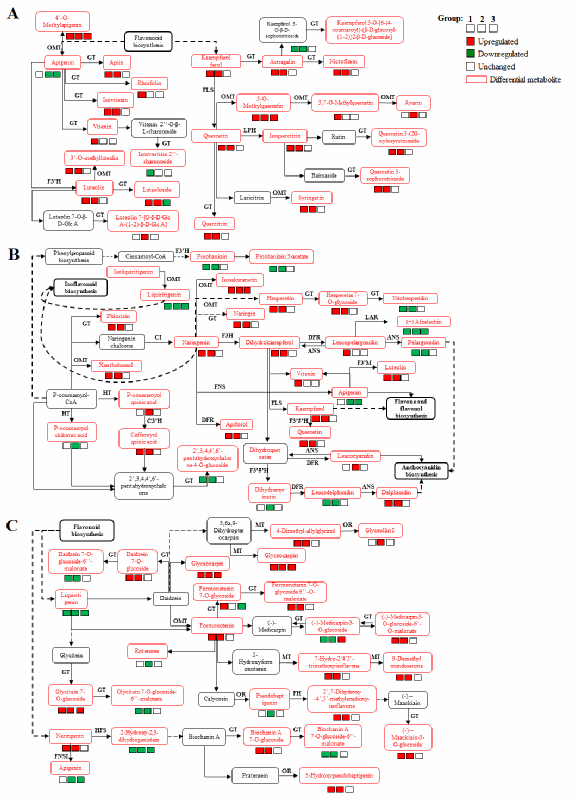 图1 橘皮粉在超声辅助固态发酵过程中黄酮类化合物积累的途径。(A)黄酮和黄酮醇生物合成途径,(B)黄酮类生物合成途径,(C)异黄酮生物合成途径。