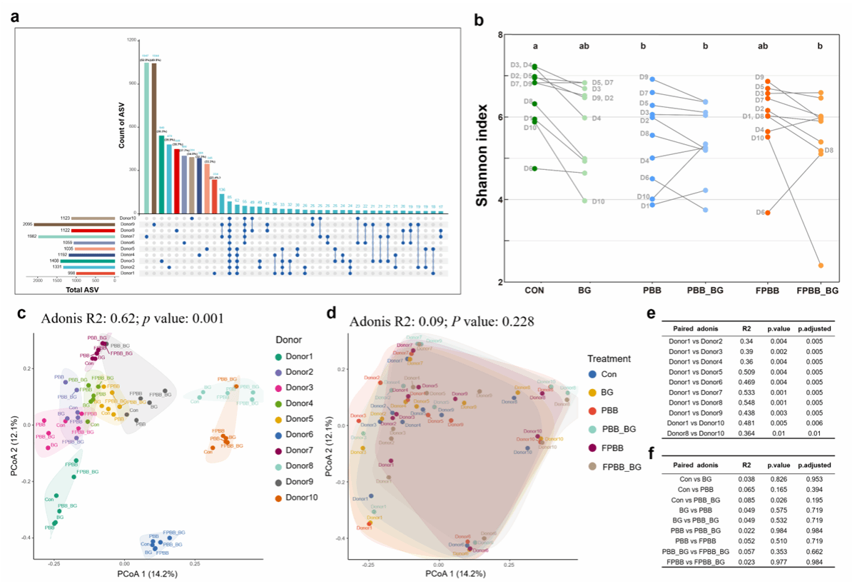 全谷物含有多种不同结构的可溶性纤维和不可溶性膳食纤维,它们共同促进人体肠道微生物健康,并有助于降低慢性疾病风险。现有研究较多关注单种结构多糖对肠道微生物的调节作用,而全谷物中可溶性纤维和不可溶性纤维在肠道酵解过程中的代谢联系仍不甚清晰。本研究使用10名健康志愿者的新鲜粪便样本,模拟肠道菌群的个体差异,并开展体外发酵实验。实验分组包括不含碳水化合物的对照组(Con),以及含大麦可溶性β-葡聚糖(BG)、含预消化大麦麸皮(PBB)、同时含BG和PBB(PBB_BG)的处理组。通过与Con组进行比较,观察菌群个体差异对BG和PBB酵解特性的影响;通过与PBB组进行比较,评估BG降解对PBB酵解特性的影响。