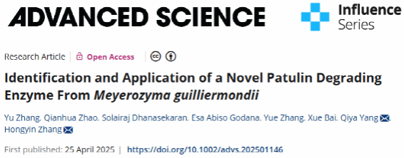 近日,我校食品与生物工程学院张红印教授团队在国际综合性顶刊 《Advanced Science》在线发表论文“Identification and application of a novel patulin degrading enzyme from Meyerozyma guilliermondii”。博士生张钰为第一作者,张红印教授及杨其亚副教授为共同通讯作者,课题组赵倩华、Solairaj、Esa、张乐和白雪也参与了该项工作。