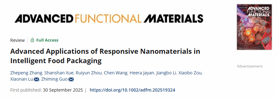 近日,我院郭志明教授团队在国际Top期刊《Advanced Functional Materials》(Q1,IF2024: 19)上发表论文“Advanced Applications of Responsive Nanomaterials in Intelligent Food Packaging”。博士研究生张浙鹏为第一作者,江苏大学郭志明教授和加拿大麦吉尔大学Xiaonan Lu教授为共同通讯作者。