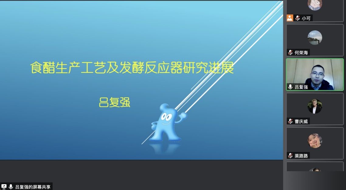 举办的“产业教授进校园活动”顺利举行,本次会议邀请江苏省产业教授、江苏恒顺醋业股份有限公司企业管理部部长吕复强做 “食醋生产工艺及发酵反应器研究进展”的专题报告,报告通过腾讯会议直播。食品物理加工研究院常务副院长何荣海教授主持会议,新葡京娱乐城app